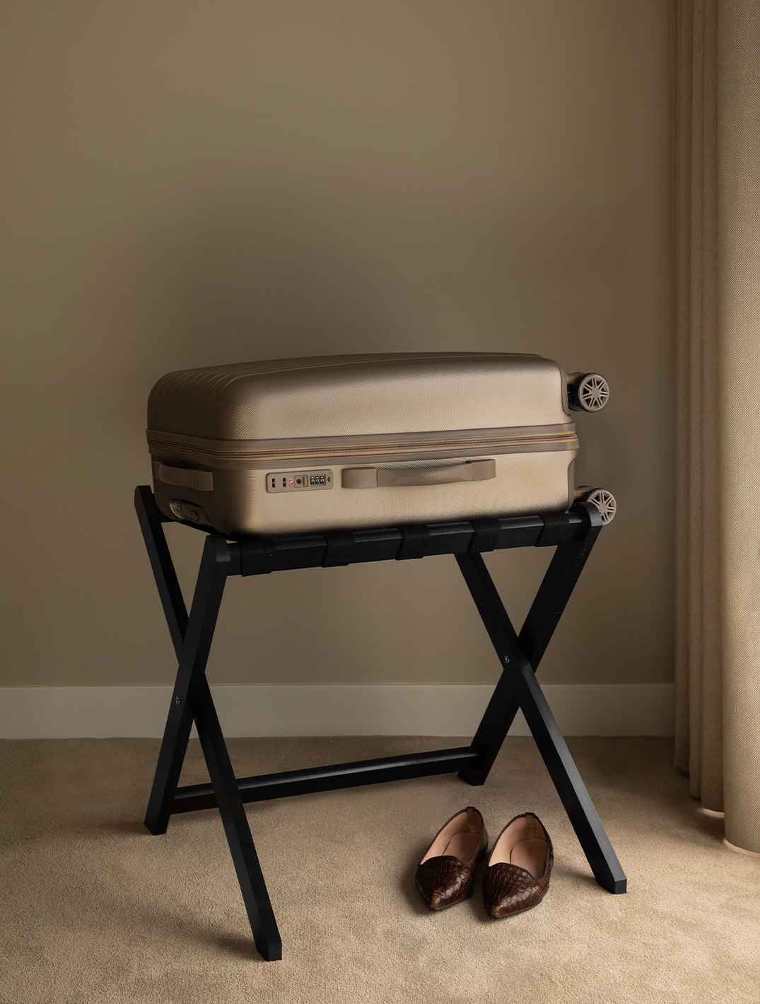Luxus und Funktionalität zieht in Ihre Hotelzimmer ein mit den Mahagoni-Gepäckständern von Bentley in Schwarz. Ein aufgeräumtes und stilvolles Hotelzimmer macht den Aufenthalt Ihrer Gäste noch angenehmer. Der klappbare Mahagoni-Gepäckständer von Bentley kombiniert edles Design mit praktischer Handhabung. Gefertigt aus hochwertigem europäischem Mahagoniholz, fügt er sich harmonisch in jede anspruchsvolle Hotelausstattung ein. Seine stabile Konstruktion bietet eine verlässliche Ablage für Koffer und Taschen, während das klappbare Design eine platzsparende Aufbewahrung ermöglicht. Ideal für Hotels, die ihren Gästen maximalen Komfort und eine durchdachte Raumnutzung bieten möchten.
