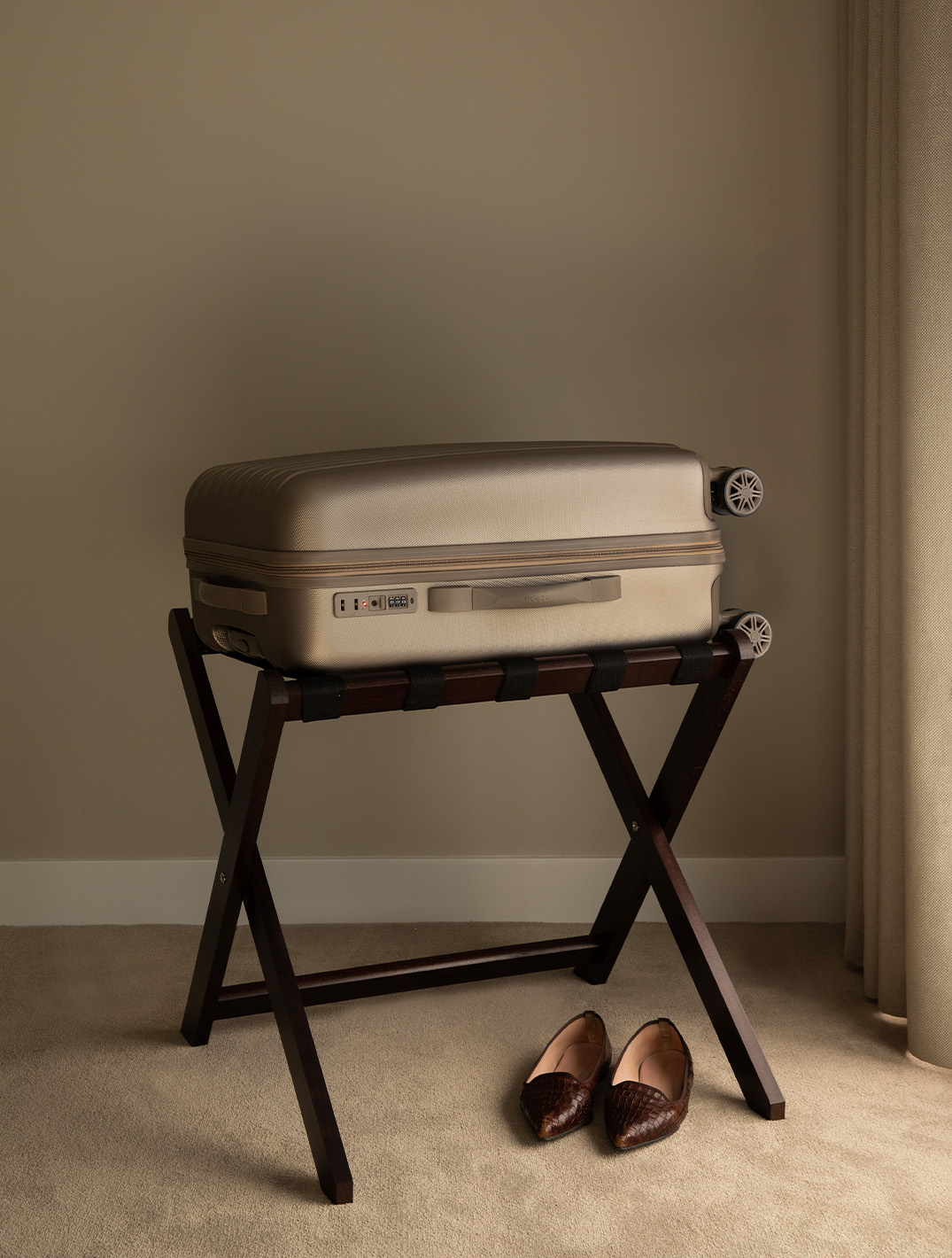 Elevate your guests' experience with Bentley's Mahogany Luggage Rack. We understand the importance of providing your guests with the ultimate luxury experience. That's why we've created our folding mahogany luggage rack, which is the perfect combination of style and functionality. It is crafted from premium mahogany wood from Europe, giving it a sophisticated and elegant look that will complement any hotel room. And, with its folding design, it's the perfect solution for hotels that want to provide their guests with the ultimate convenience. The luggage rack can be easily stored away when not in use, freeing up valuable floor space.