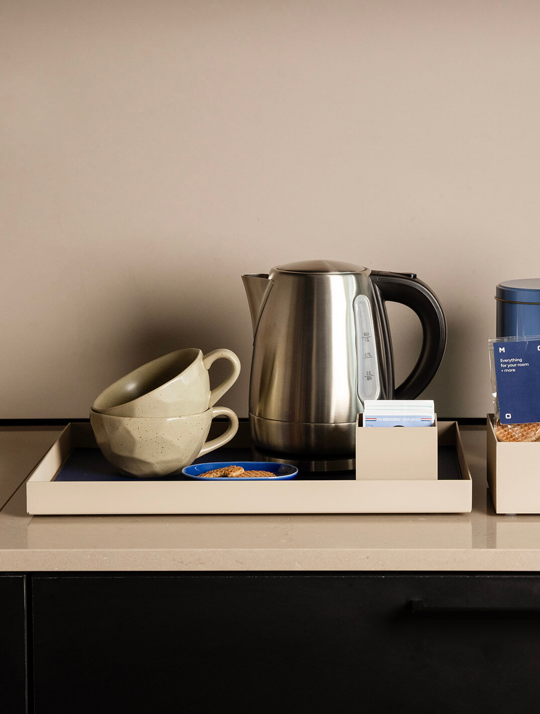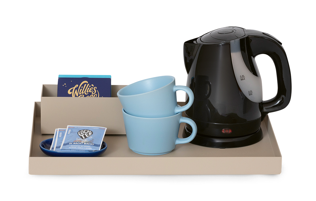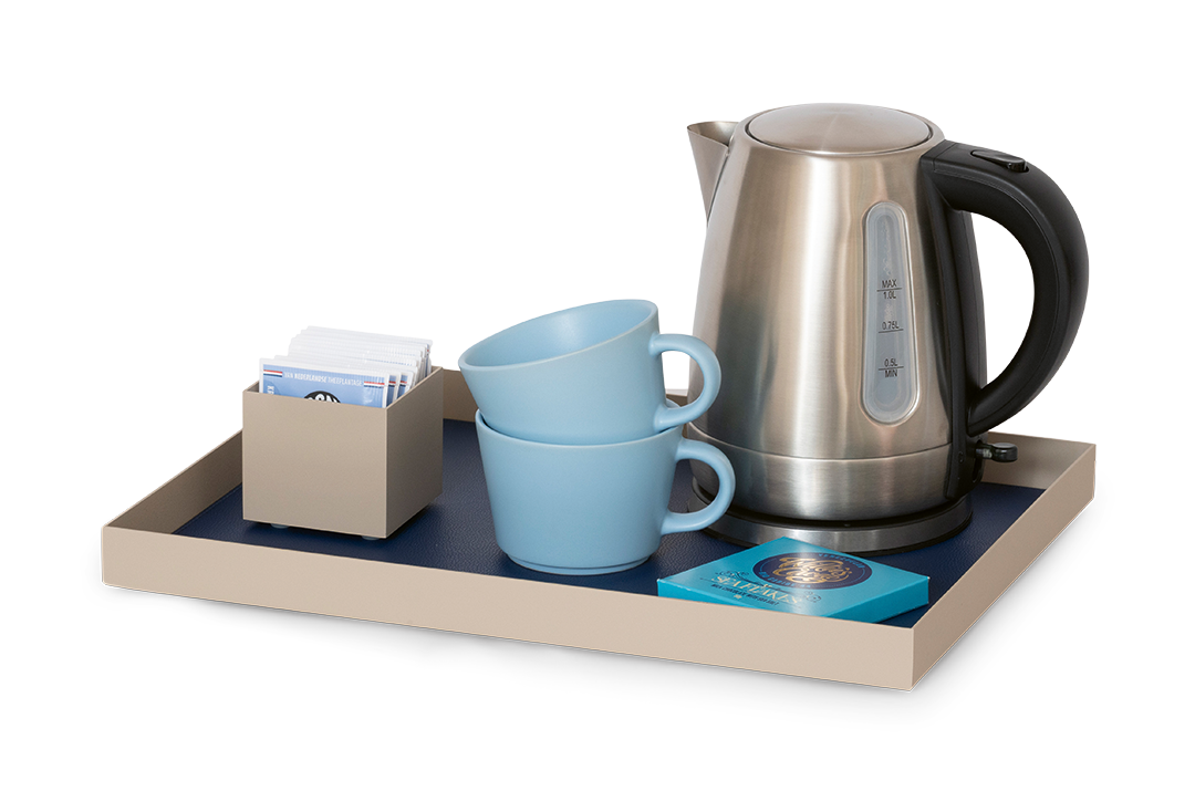 Designed for convenience, this rectangular tray features precise cut-outs to keep electric cords neatly in place—ensuring a tidy and organised tea and coffee station for your guests. With its sturdy build and modern design, the Sophia Beige Welcome Tray offers both practicality and style.