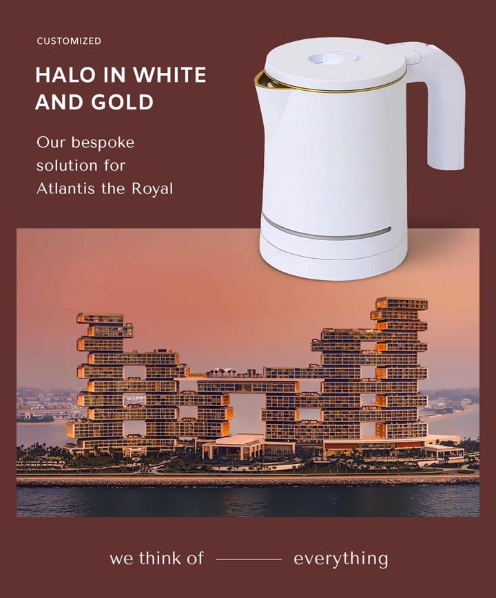 We provided several in-room items of which a special Halo kettle. To fit the rooms' design we have created a full white Halo kettle with golden accents. The Halo kettle is a double-wall, cool touch hotel kettle. Ideally for in-room use. The development of this item for this prestigious hotel proves once more that we are able to adapt to any hotel room design in the world.
