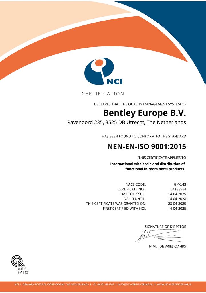 Nous sommes heureux d’annoncer que Bentley Europe a officiellement obtenu la certification ISO 9001. Cette norme de qualité, reconnue à l’international, confirme notre engagement constant en matière d’amélioration, de satisfaction client et de processus professionnels.
