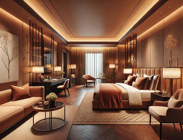 Par exemple, nous avons imaginé un ensemble d'articles pour l’espace de vie, comprenant un organiseur modulable pour le café et le thé, une tasse en bronze, un plateau pour les articles de courtoisie, une boîte en bois pour les mouchoirs, et une poubelle ovale.
